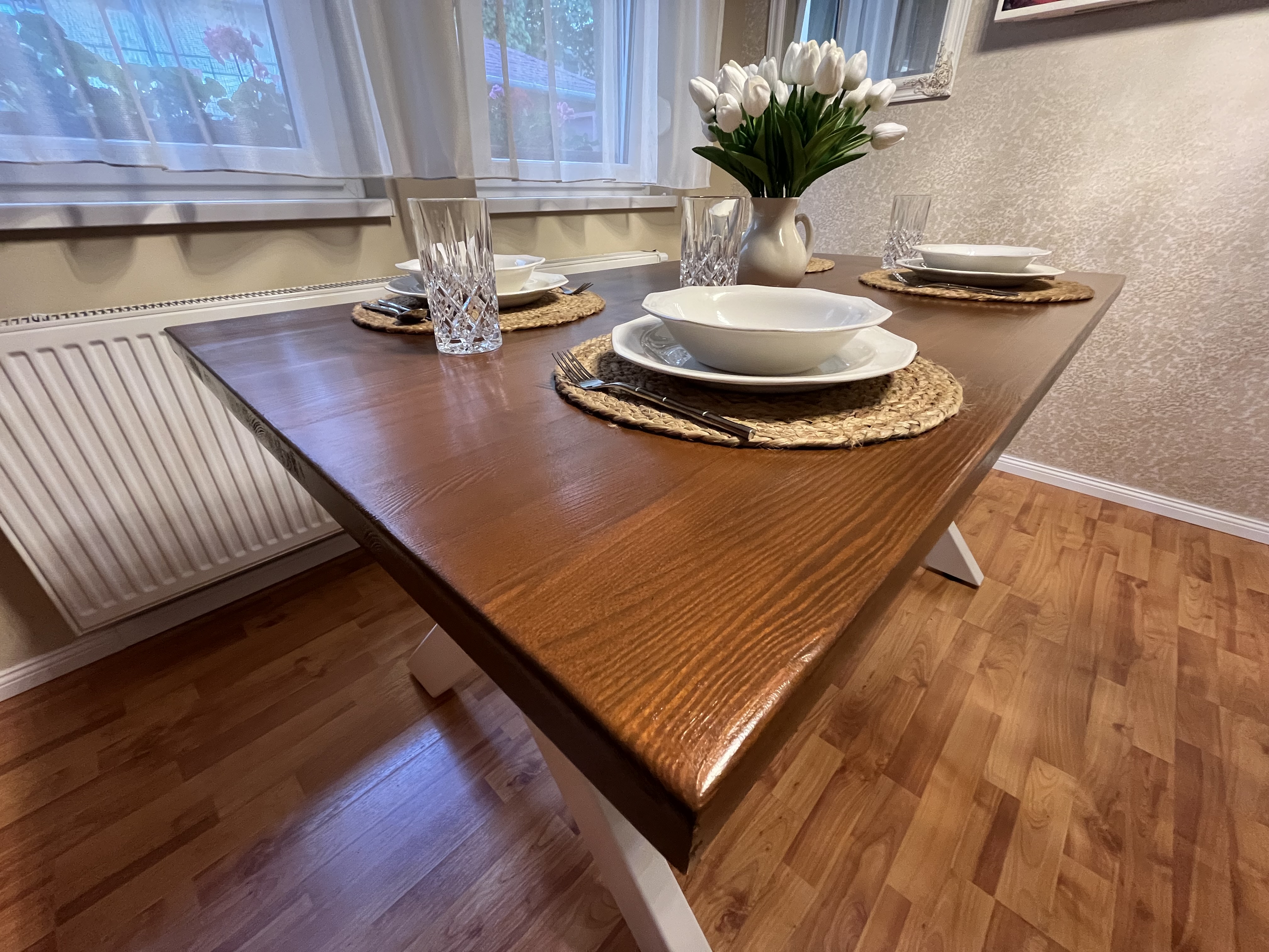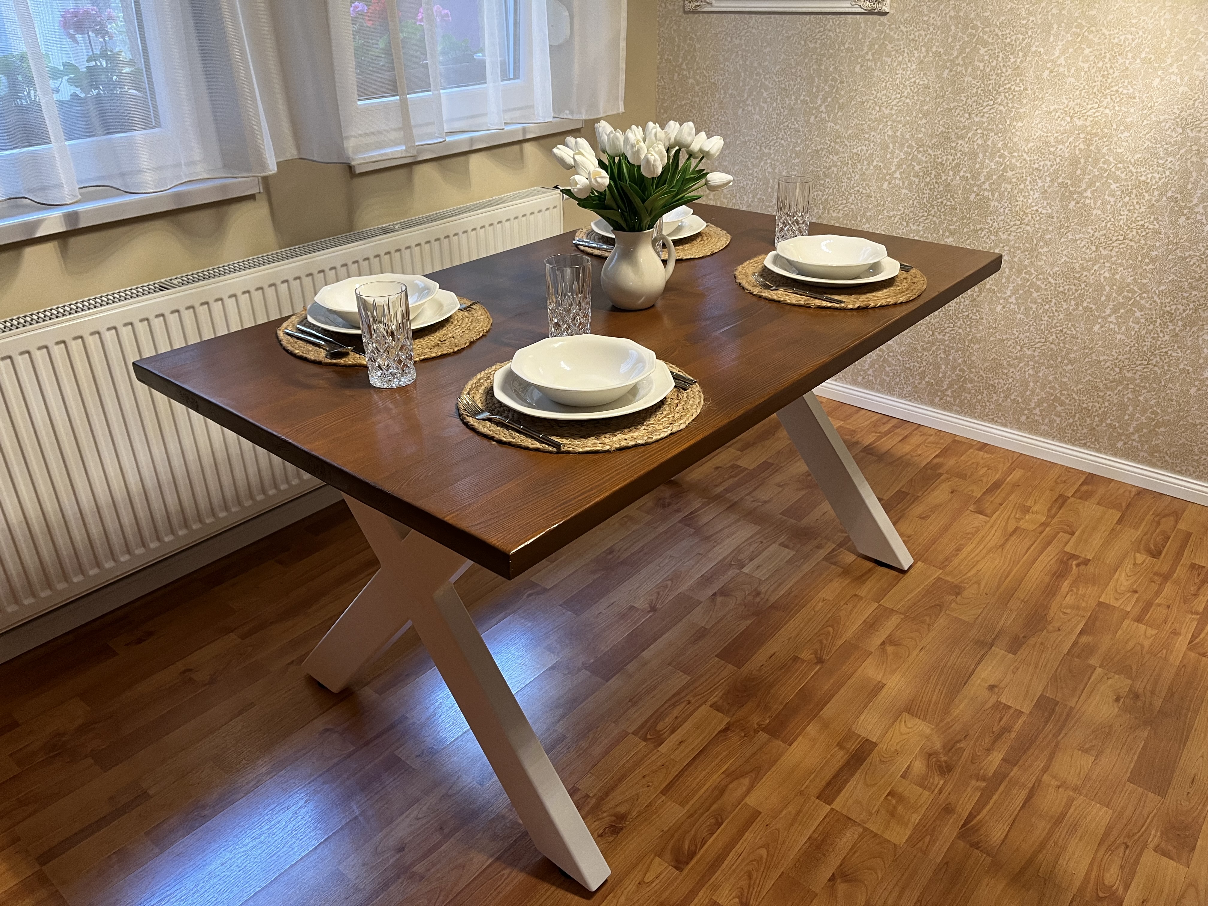 Kézzel készült fa asztal fém lábakkal – időtlen elegancia és tartósság.